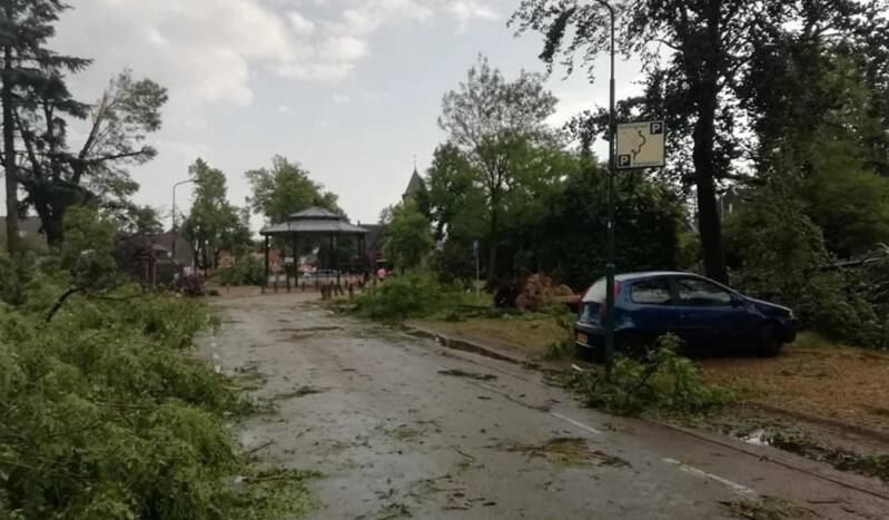 Scherpenzeelseweg met muziekkoepel en Kerkplein. Links is de begraafplaats. Deze foto is enkele uren na de valwind gemaakt.