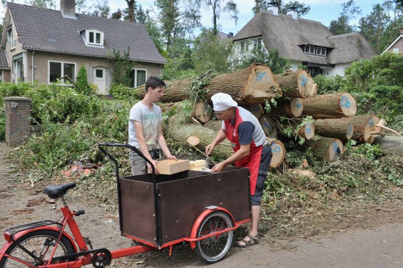 Een week na de valwind heeft Dorpssoep Leersum, hier bij de kerk en met een bakfiets, gratis soep uitgedeeld aan getroffen bewoners en de hulpverleners. Iedereen was in het getroffen gebied nog druk bezig met het opruimen van de gevolgen van de valwind. Met het aanbieden van de soep kwamen ook de verhalen los en werd nog maar eens duidelijk hoe ingrijpend deze gebeurtenis is. De soep werd gemaakt door Henk Jansen, eigenaar van het pannenkoekenrestaurant op het Kerkplein. Het terras van zijn restaurant was zwaar getroffen door de valwind.