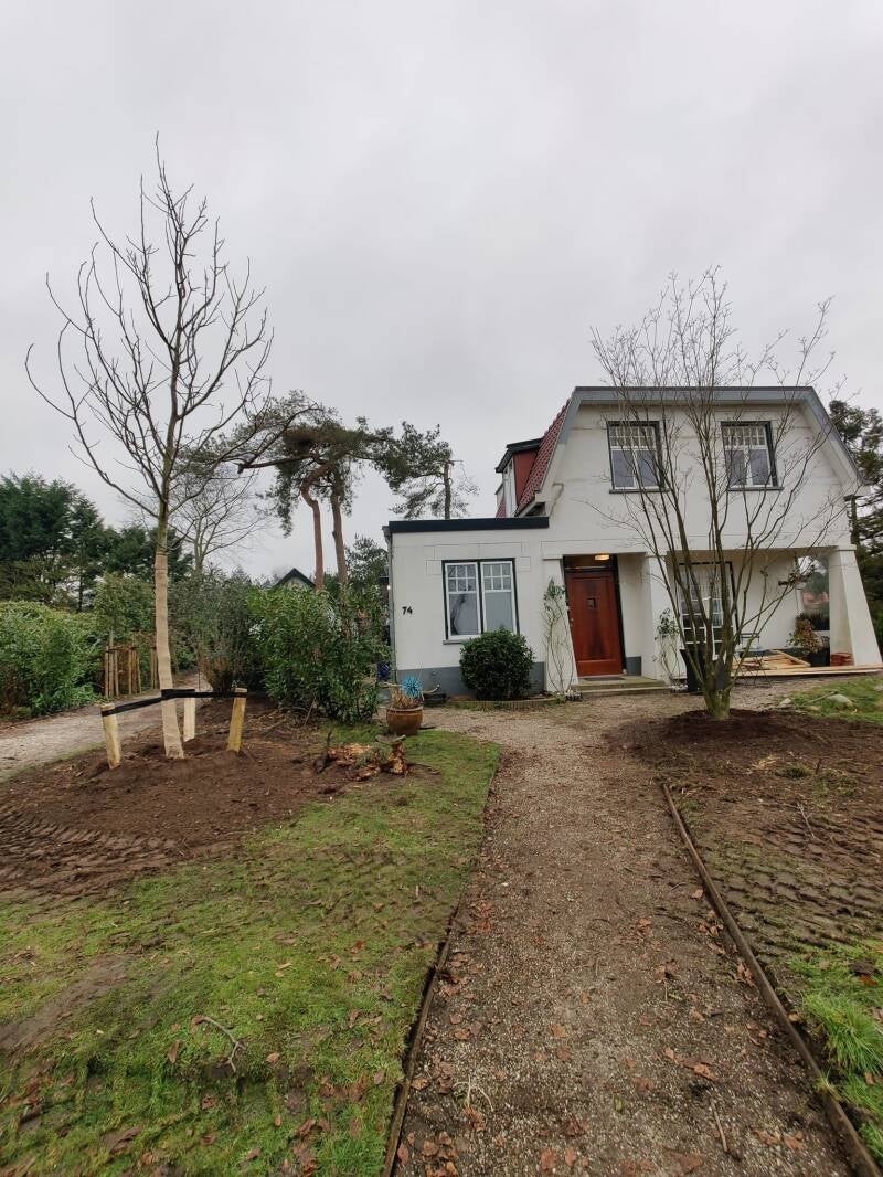 Deze witte Belle Epoque woning uit 1921 was omringd door een echte bostuin met oude dennen en vele andere, hoge bomen. De huidige bewoners vielen als een blok voor de tuin, en kochten het huis in 2019. Ze waren net klaar met de verbouwing, toen de valwind hen overviel – met haar op het platte dak links en hem in de voortuin. Er is veel aan beschermengelen en engelen op schouders gerefereerd door inwoners. Ook dit paar overleefde met een enorme portie geluk het noodweer terwijl bijna alle hoge, grote bomen op en om het huis vielen. Het huis was zo zwaar beschadigd dat het stel – net als sommige andere Leersumers - er pas na tien maanden in terug kon keren, al was het toen nog lang niet af. Dat was het pas in het voorjaar van 2023. Onzekerheden, de voortdurende aanwezigheid van bouwvakkers, de financiële rompslomp en de overleggen met verzekeraars en schade-experts trokken een grote wissel op Leersumers die dusdanig zwaar getroffen waren. Als een van de weinigen hadden deze bewoners een tuinverzekering. Mede daardoor konden zij echt grote bomen terugplaatsen. Ook legden zij een grote vijver aan. Het rijke dierenleven in hun tuin is inmiddels hersteld, al doen andere diersoorten hem nu aan. De impact van de valwind op huisdieren was ook groot, zeker bij dieren die de valwind buiten meemaakten. Nieuwe wind en storm joegen angst aan. Honden misten hun vertrouwde rondjes (het Lombokbos was bijv. acht maanden dicht) en markeerplekken. Kleine, wilde dieren verloren hun schuil- en nestplekken. Het natuurgeweld eiste de meeste slachtoffers onder vogels, al heeft de Dierenambulance er nog vele tientallen gered.