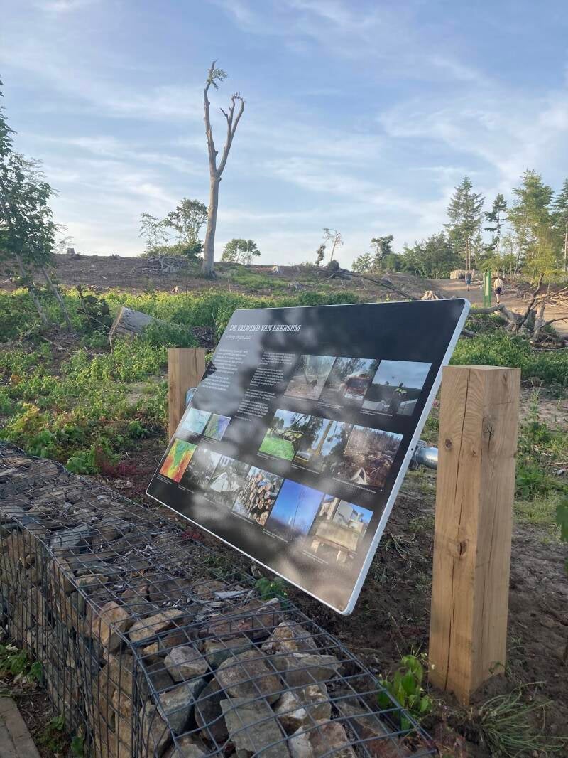 Op dit bord, dat precies één jaar de natuurramp werd onthuld, kunt u lezen wat een valwind precies is en hoe deze ontstaat. Het is een verschijnsel dat vaker voorkomt - zelfs elders in Nederland op diezelfde 18e juni 2021 - alleen trof niet eerder een valwind van deze kracht (ergens tussen de 150 – 200 km/uur) zo de bebouwde kom als in Leersum. Eerdere valwinden in de geschiedenis van ons land eisten meermaals doden, voornamelijk op campings. Molecaten Ginkelduin, het grootste vakantiepark van Leersum ten noorden van het dorp, was die dag volgeboekt, maar bleef gelukkig gespaard.