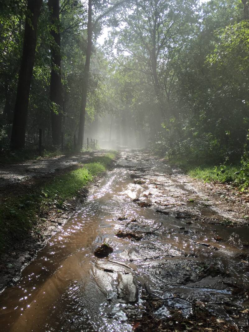 Met de valwind kwam ook een enorme hoeveelheid regen en soms ook hagel naar beneden. Dit zorgde ervoor dat er in het bos modderriviertjes ontstonden.